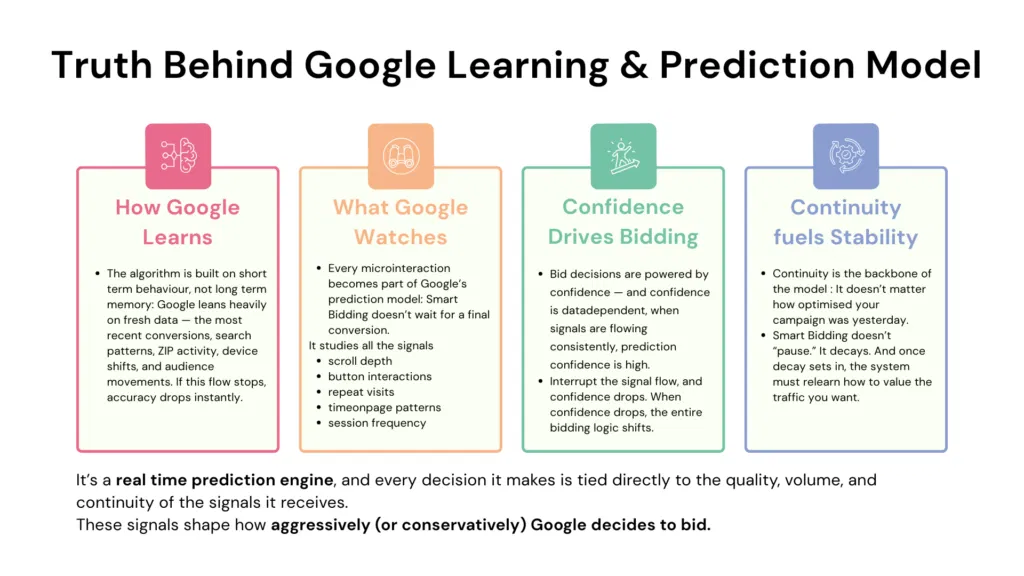 | 2. Prediction Confidence | Google stops trusting its own forecasts — who will convert, what clicks are worth, and how aggressively to bid. | Low confidence forces Google into defensive bidding: CPC rises, impressions become unstable, CTR softens. |