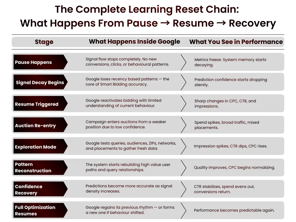 | Auction Behaviour After Resuming | What Google Does Differently | What You See in Performance |