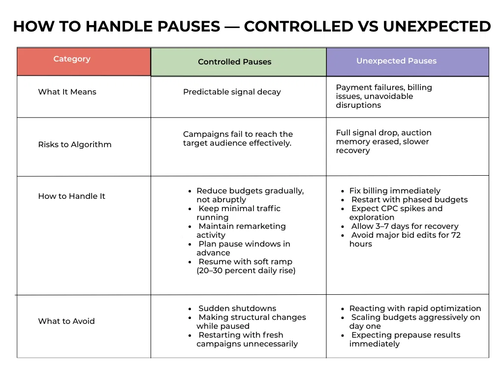 Pauses don’t damage performance by themselves. The real impact comes from how the pause is handled and how the campaign re-enters the auction system. Controlled pauses protect signal flow and reduce recovery cost. Unexpected pauses increase relearning time because the system restarts with incomplete data. Managing the environment around the pause is what determines how quickly Smart Bidding stabilizes again.