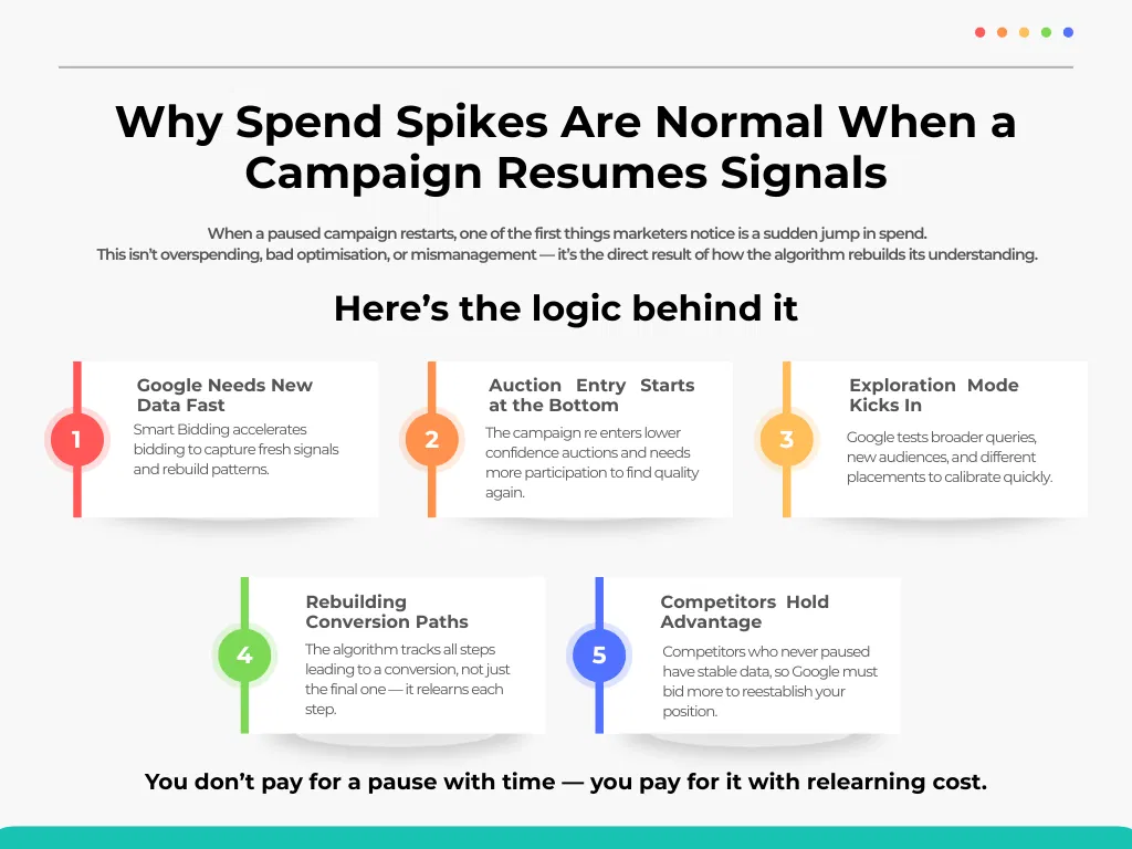 | 5. Google Forces a Relearning Auction Cycle | The system behaves as if you launched a new campaign, even if nothing changed. | Spend spikes as Google collects fresh data to rebuild your position. |