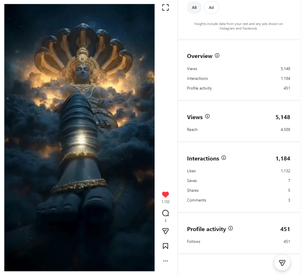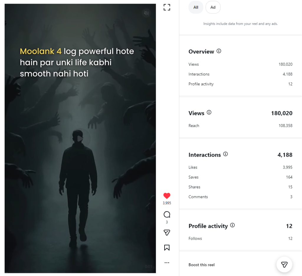This reel successfully generated massive engagement signals and pushed the content into Instagram’s distribution system.